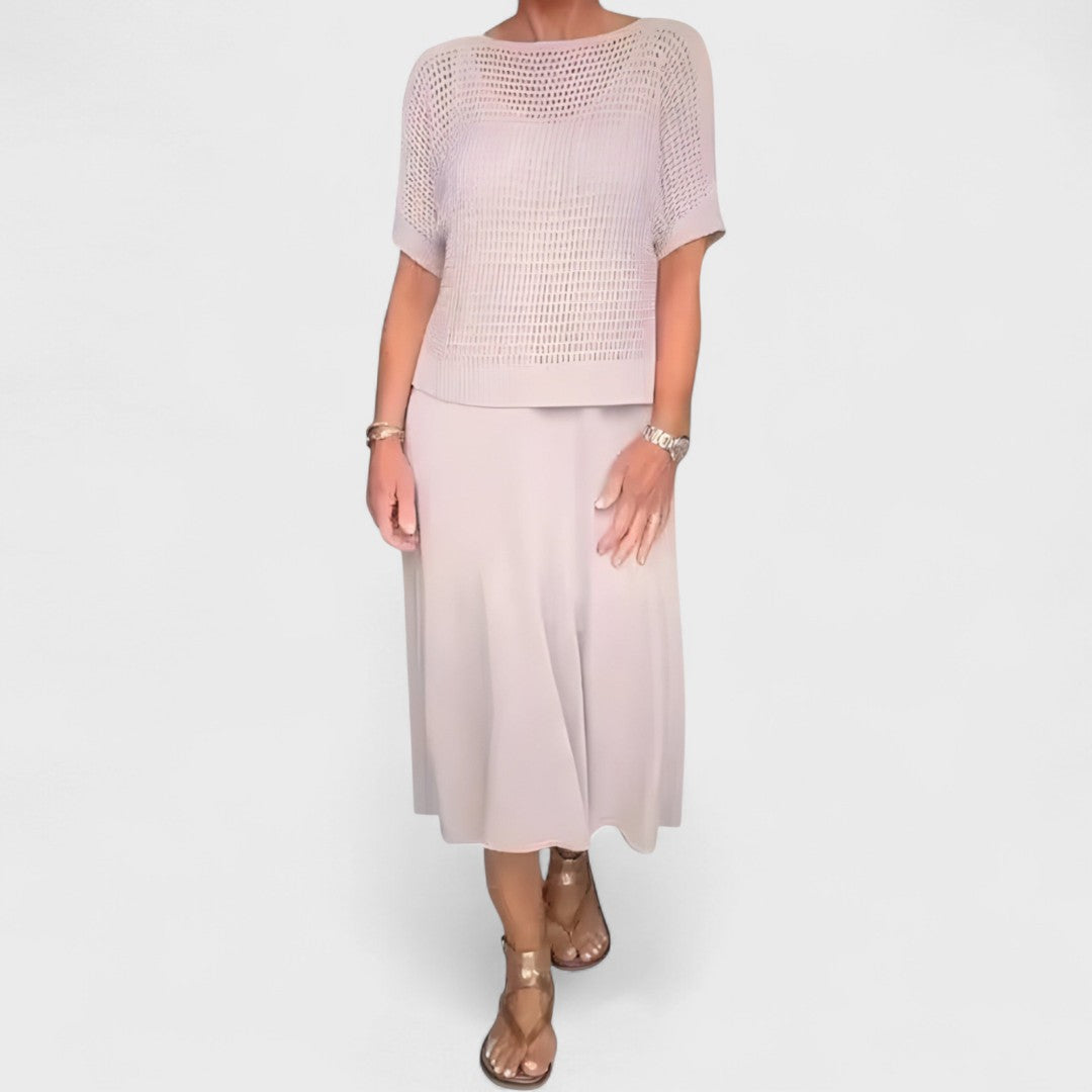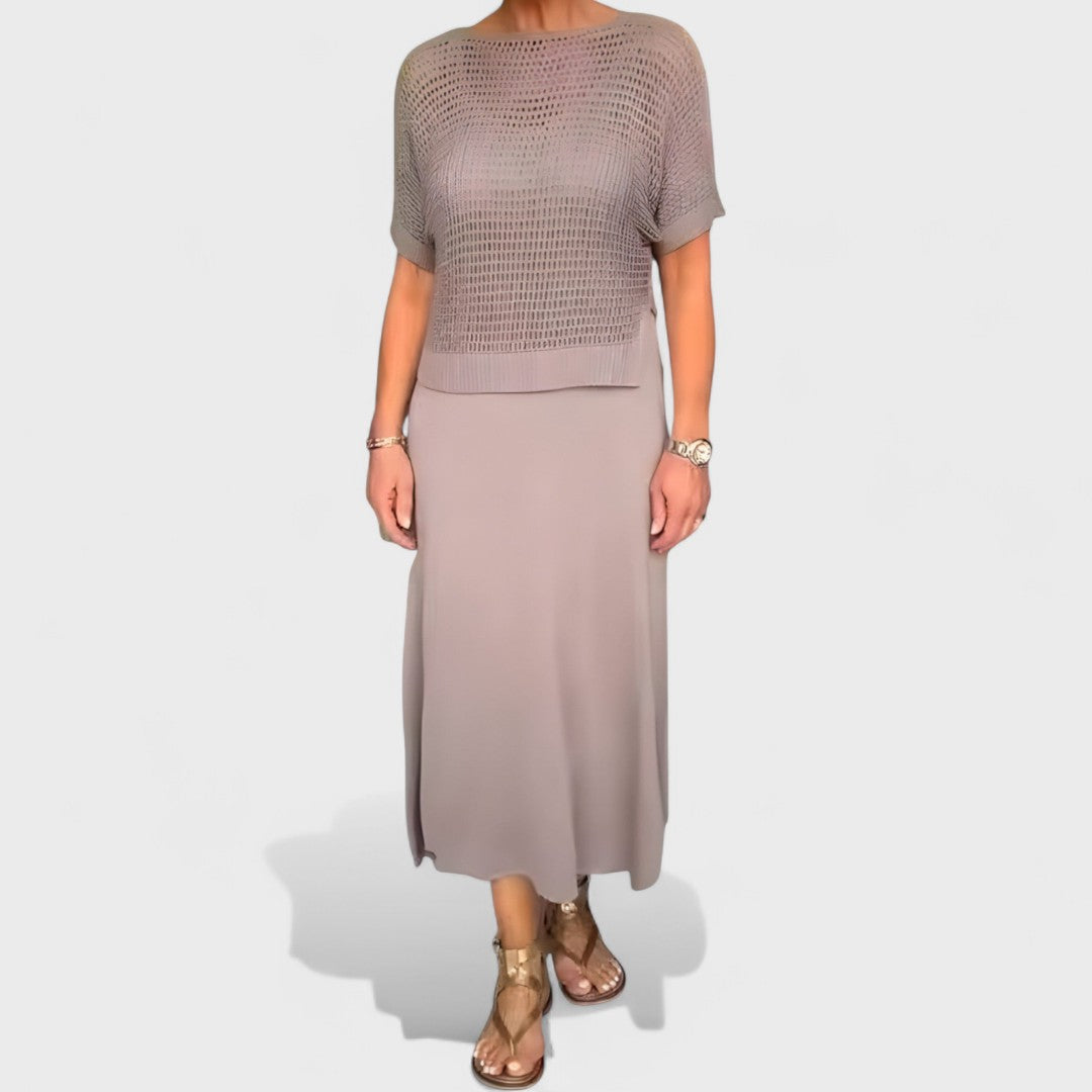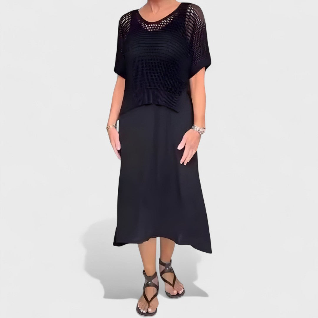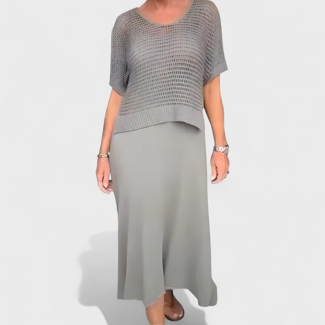 Šaty Claudia kombinují pohodlný pletený horní díl s volně splývavým spodním dílem – lehké a vzdušné řešení na horké dny. Kulatý výstřih a strukturovaný top jemně tvarují postavu, zatímco volná sukně zajišťuje komfortní volnost. Ideální volba pro denní nošení, městské procházky nebo lehké obědové chvíle s přáteli.